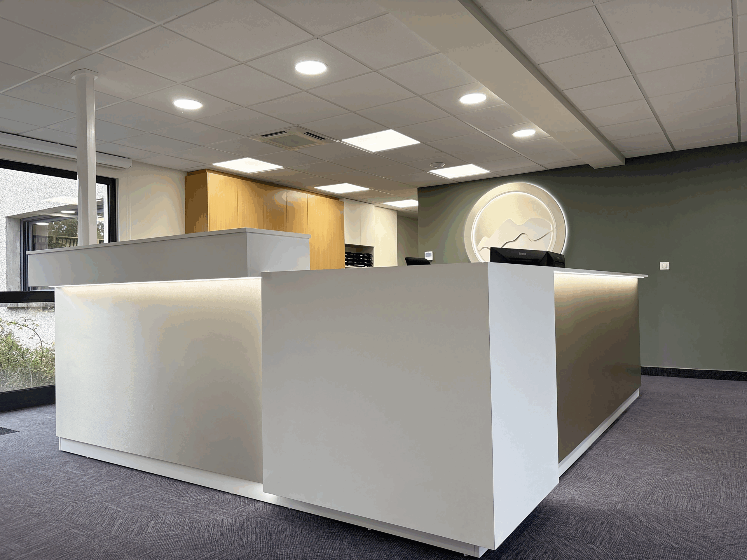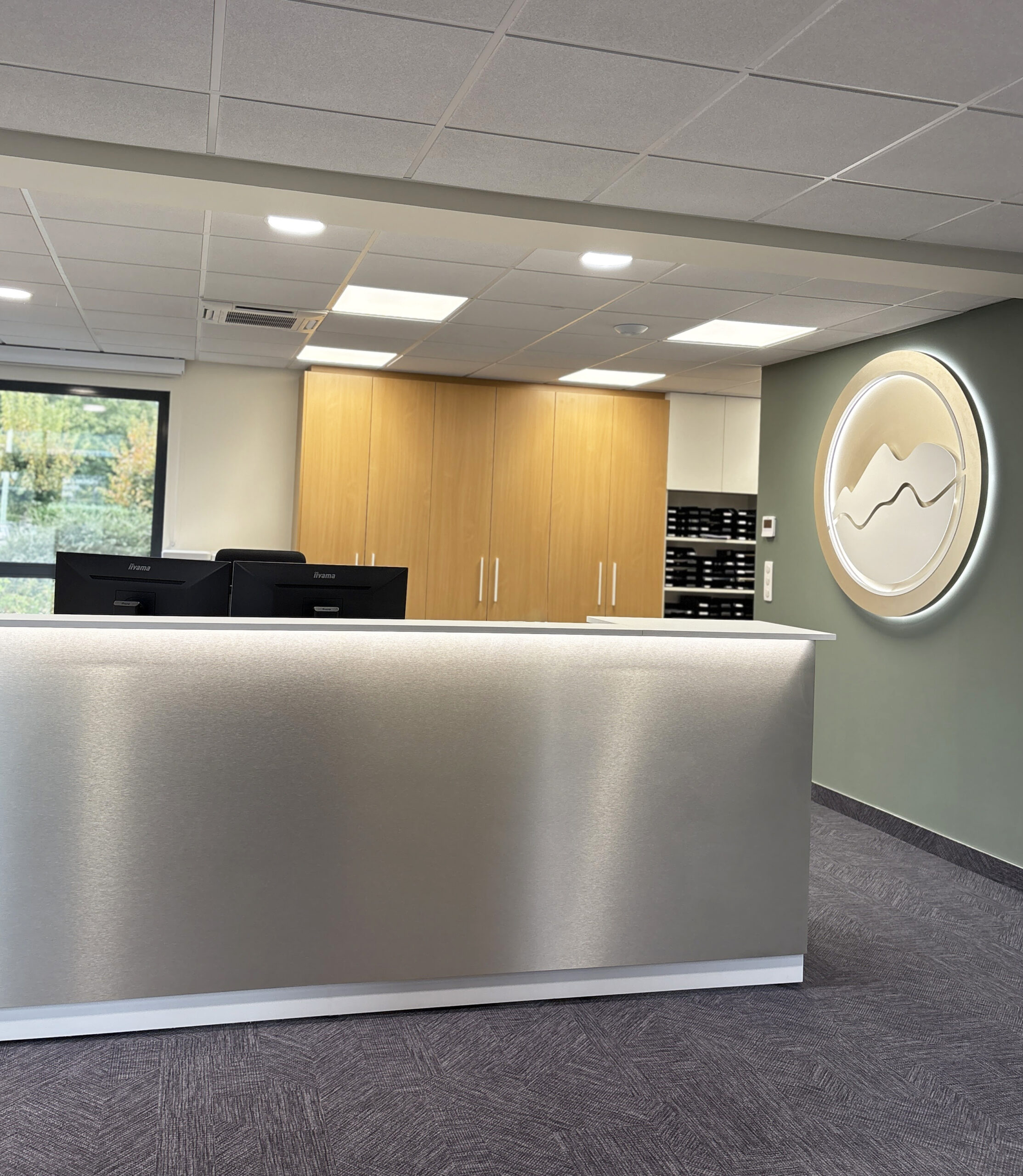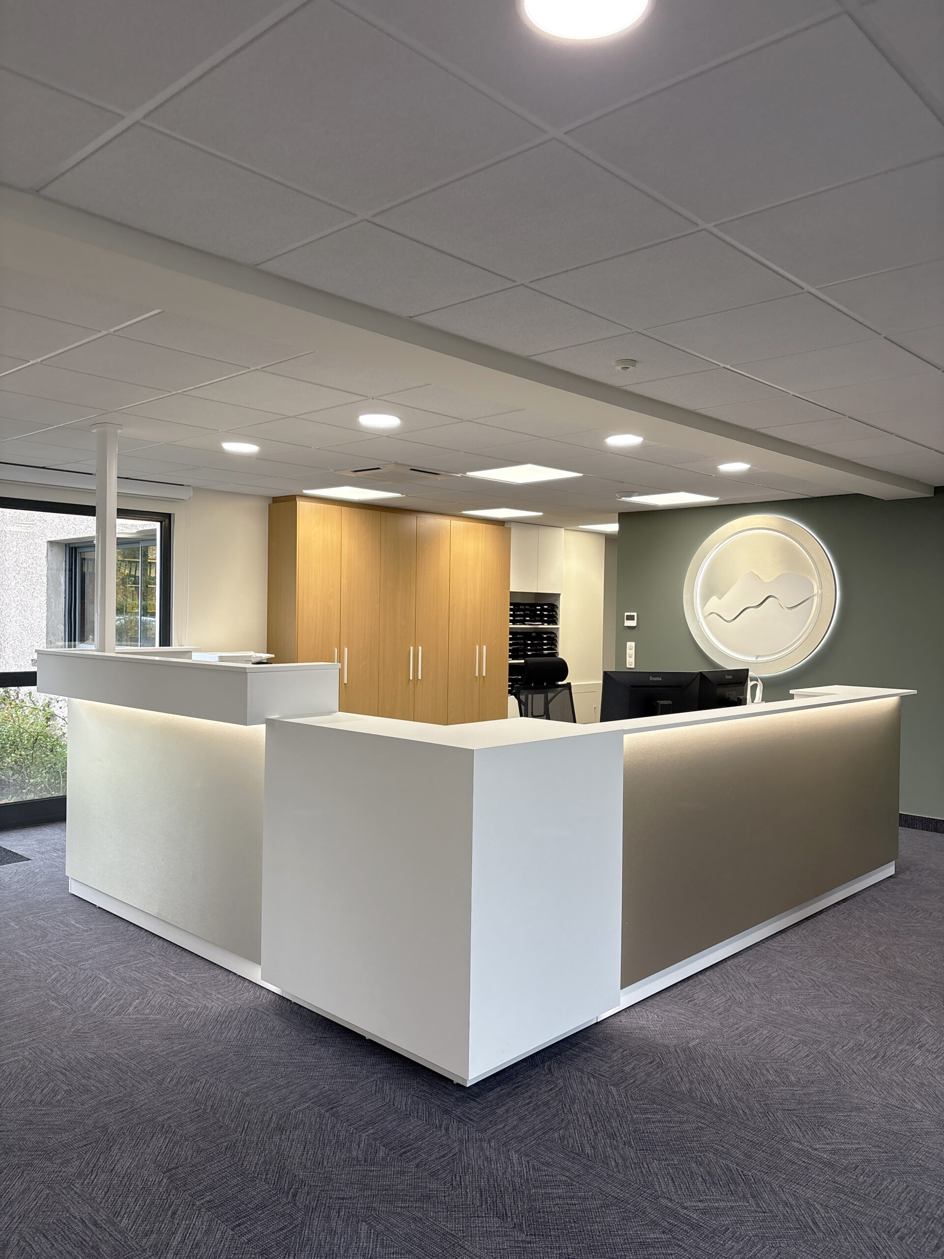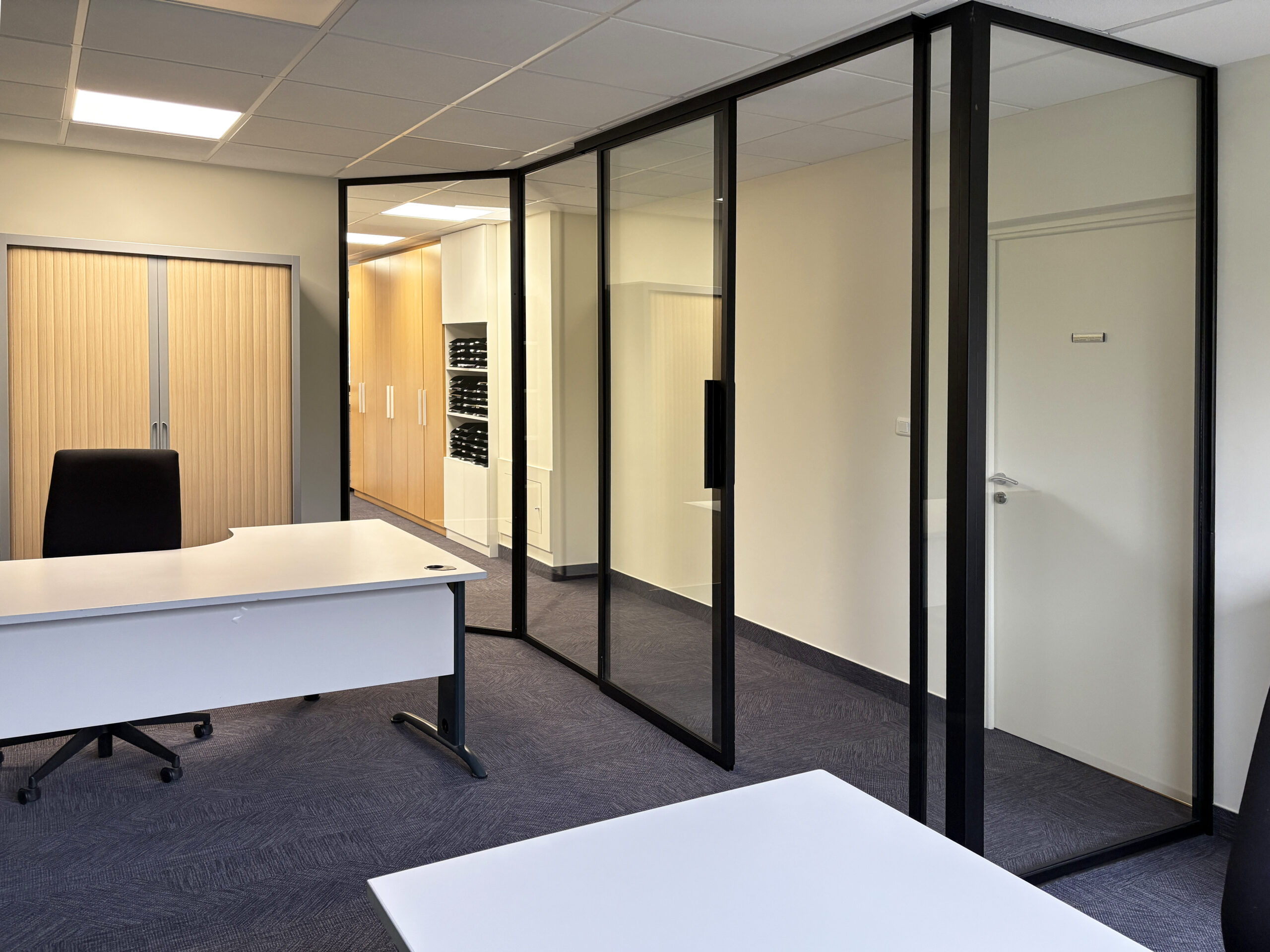 Rénovation complète de l’accueil et des bureaux, dont la création d’un bureau vitré sur mesure.